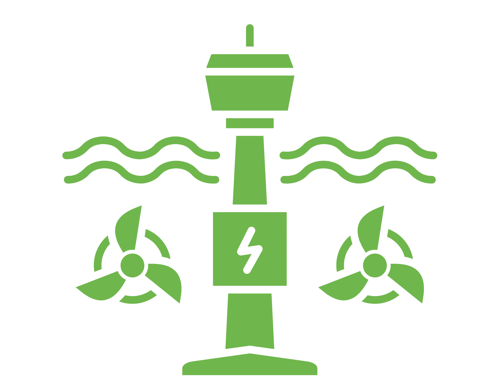 Uses fast-moving tidal currents to turn underwater turbines. Turbines may be fixed to the seabed, suspended, or arranged in arrays. Power is carried to shore via undersea cables.
