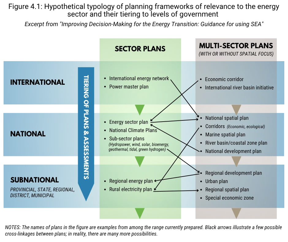 The way SEA supports energy planning depends on each country’s wider planning framework—across national, regional, and local levels, and in coordination with other sectors. Figure 4.1 below illustrates this framework, showing how energy-sector plans relate to broader spatial and development planning systems.
